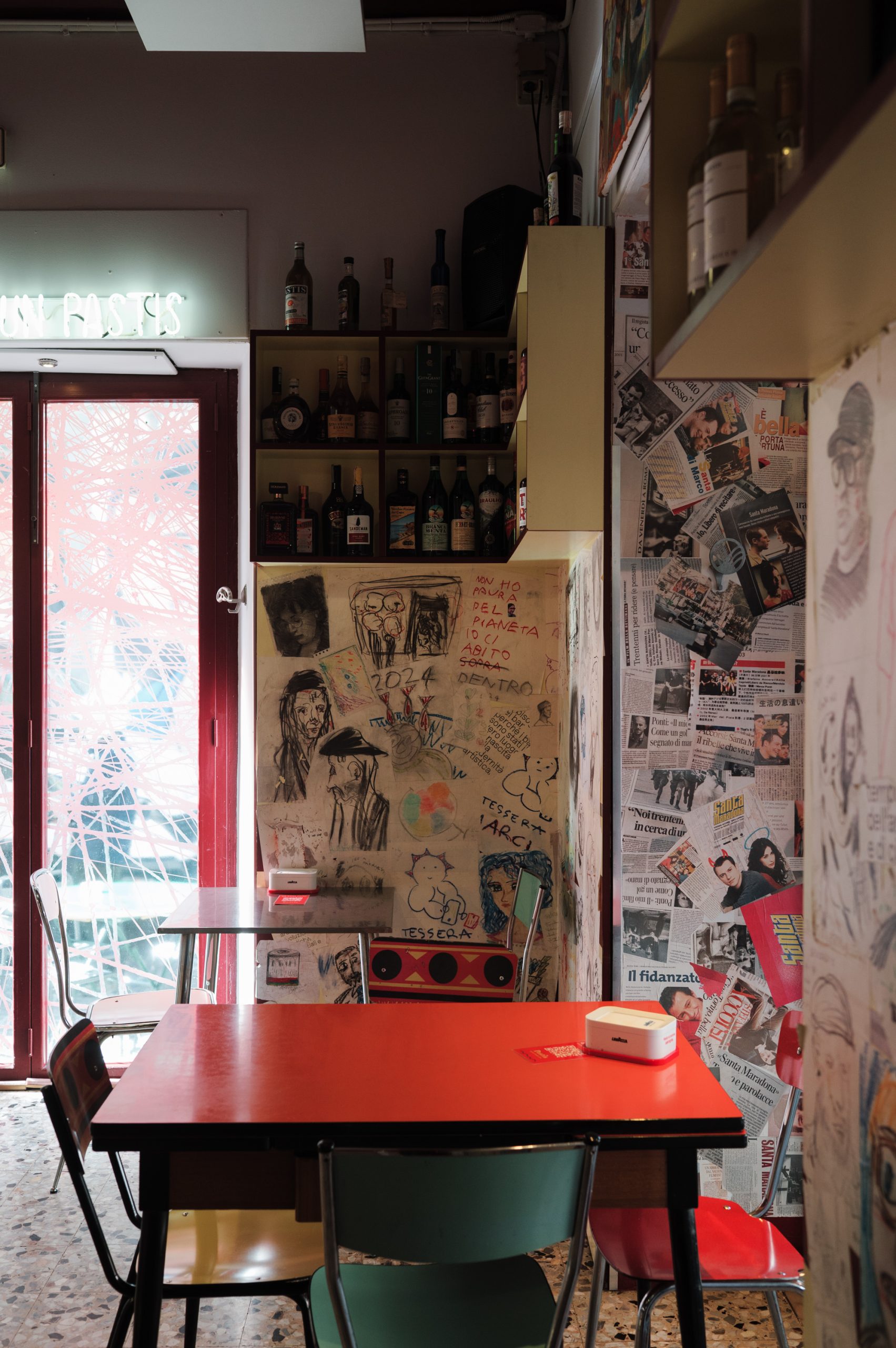 Aperto tutto il giorno, ci si può accomodare al Pastis per una colazione, un pranzo, un aperitivo, un drink dopo cena. Artisti, scrittori, imprenditori, operai si trovano ai tavolini, dove possono scambiare idee e opinioni liberamente — perché a tavola si è tutti e tutte alla pari. Così, a volte, nascono progetti che durano nel tempo. Come Sugo News, la “rivista da tavola” stampata su tovaglietta e oggi distribuita a Torino, Milano e Genova, che proprio qui ha fatto la sua comparsa.